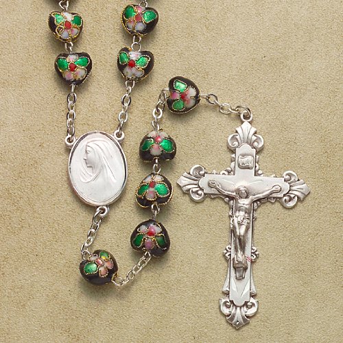 Sterling Silver Rosary Rosaries Catholic Black Cloisonne Enamel Heart Beads
